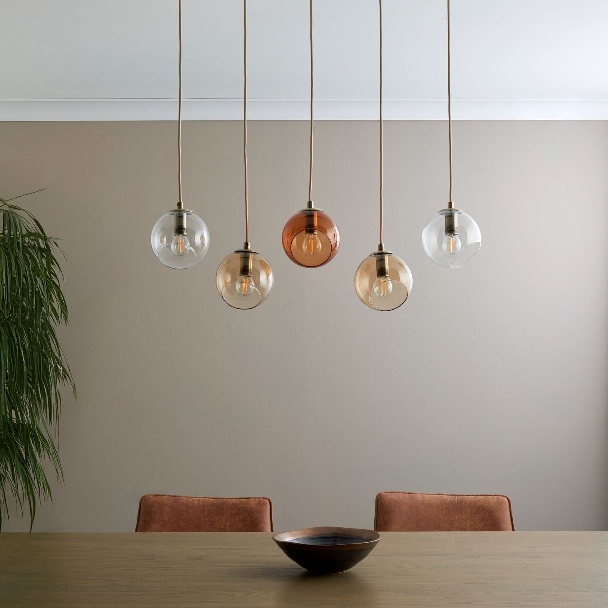 Elevate your interior with the Branco 5-light pendant bar, a sophisticated blend of modern style and warm elegance. This striking fixture features five globe shades, artfully arranged in varying hues of clear and amber glass, creating a stunning visual effect. The antique brass ceiling fixture and detailing add a touch of vintage charm, perfectly balancing the contemporary design of the glass. Ideal for dining rooms, kitchen islands or open-plan spaces, the Branco antique brass pendant bar provides ample illumination while serving as a captivating focal point. Its combination of warm tones and sleek finishes makes it a versatile choice for both modern and transitional interiors.