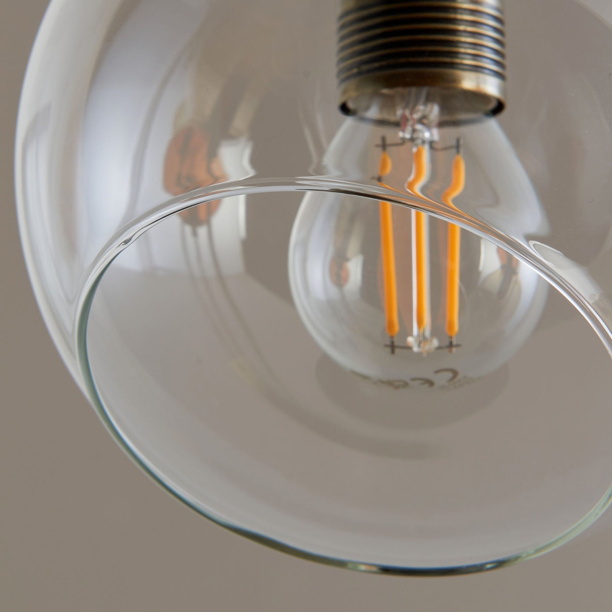 Branco 5-light pendant bar, featuring globe shades in varying clear and amber glass, with an antique brass ceiling fixture and detailing.