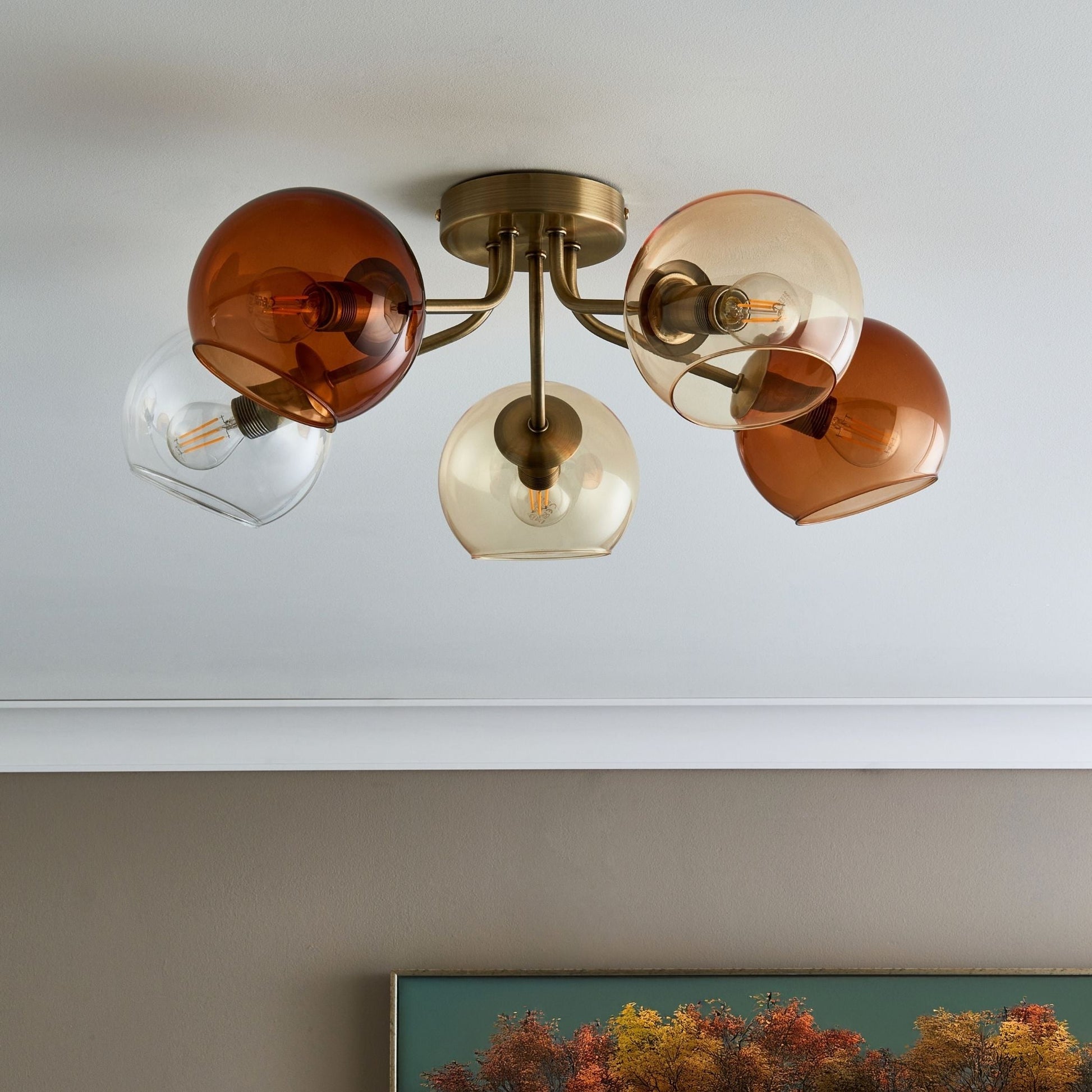 Branco 5-light semi-flush ceiling light, featuring globe shades in varying shades of clear and amber glass, with an antique brass ceiling fixture and detailing.