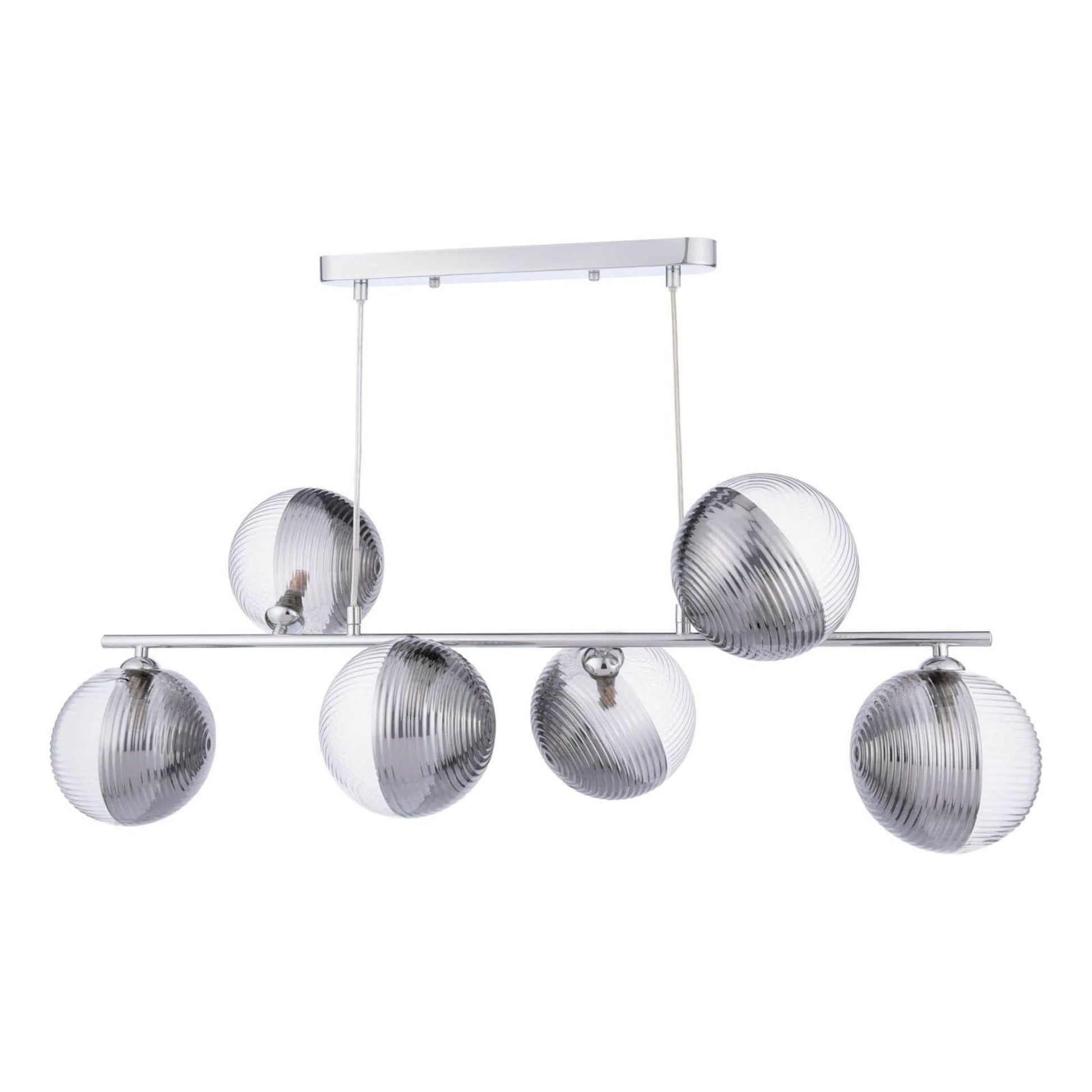 Elevate your interior with the Claudia 6-Light pendant bar, a sophisticated lighting fixture that exudes modern elegance. Featuring a sleek polished chrome frame, this pendant bar is designed to make a statement above dining tables, kitchen islands or in contemporary living spaces. The smoked glass spherical shades are intricately crafted with opposing radial and linear ribbing, adding texture while softly diffusing the light. This combination of reflective chrome and moody smoked and clear glass creates a stunning contrast, enhancing any room with its stylish, contemporary charm. The Claudia pendant bar perfectly balances aesthetics and functionality for a truly striking addition to your decor.