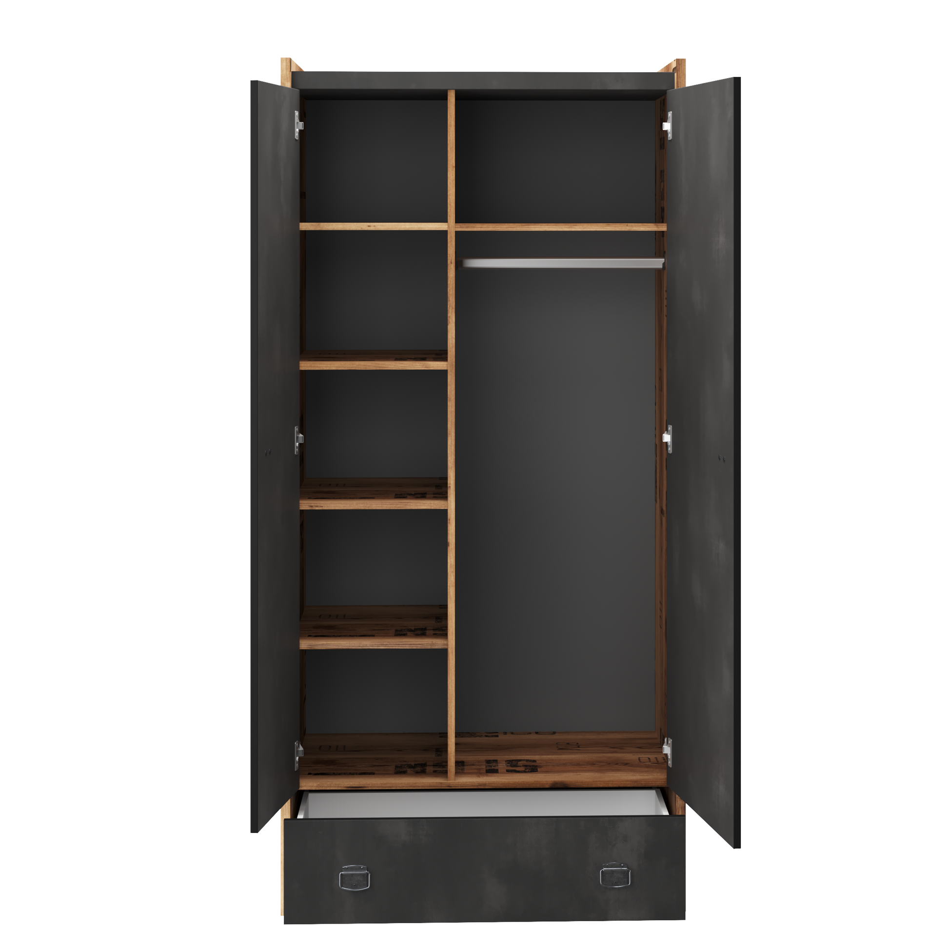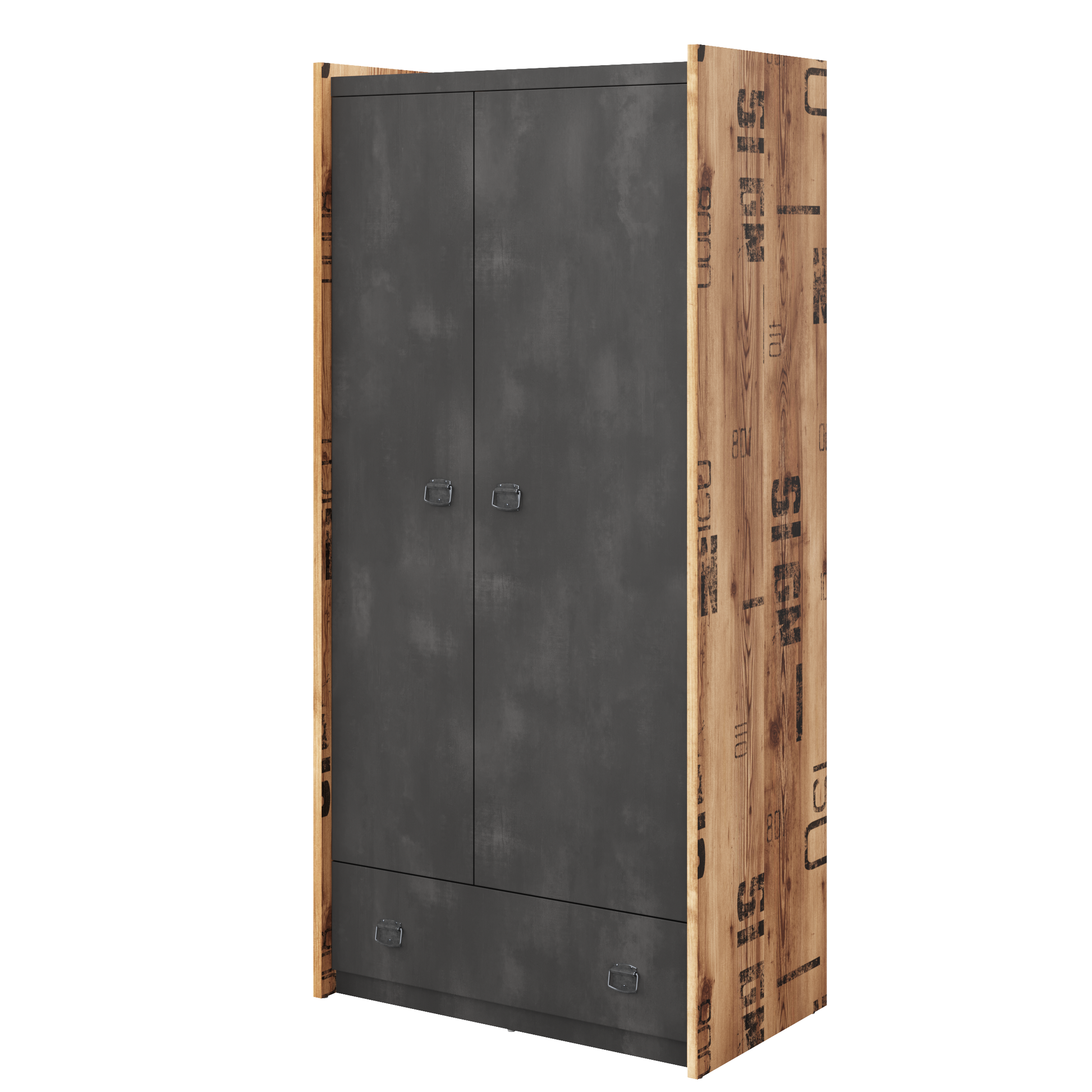 The Fargo Wardrobe 02 is a three-door storage unit crafted from solid laminated board with a vintage Alpine Spruce décor and fronts that imitate raw concrete, creating a contemporary industrial aesthetic. Designed for practical organization, the wardrobe includes two drawers and two open compartments in addition to generous hanging and shelf space behind the doors.