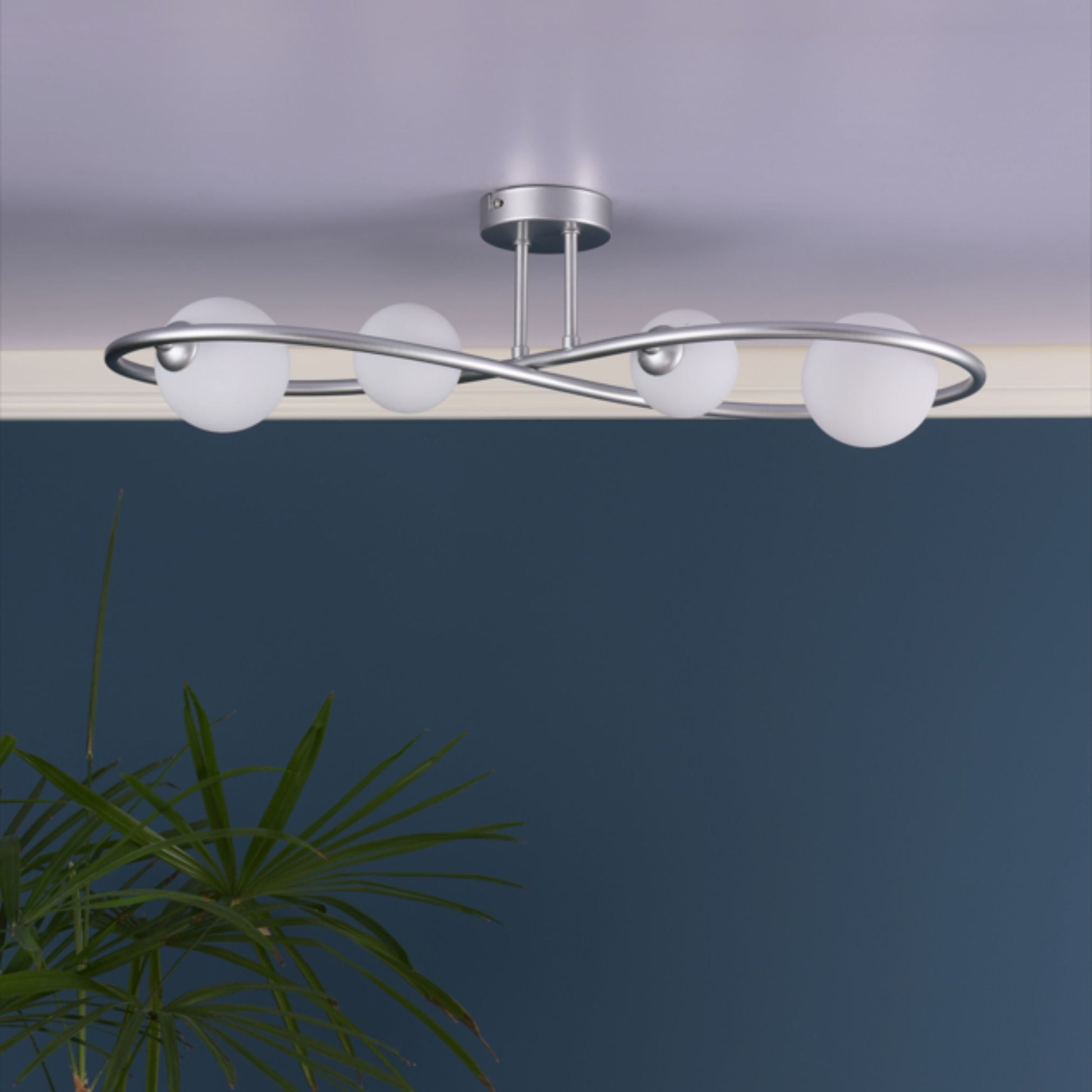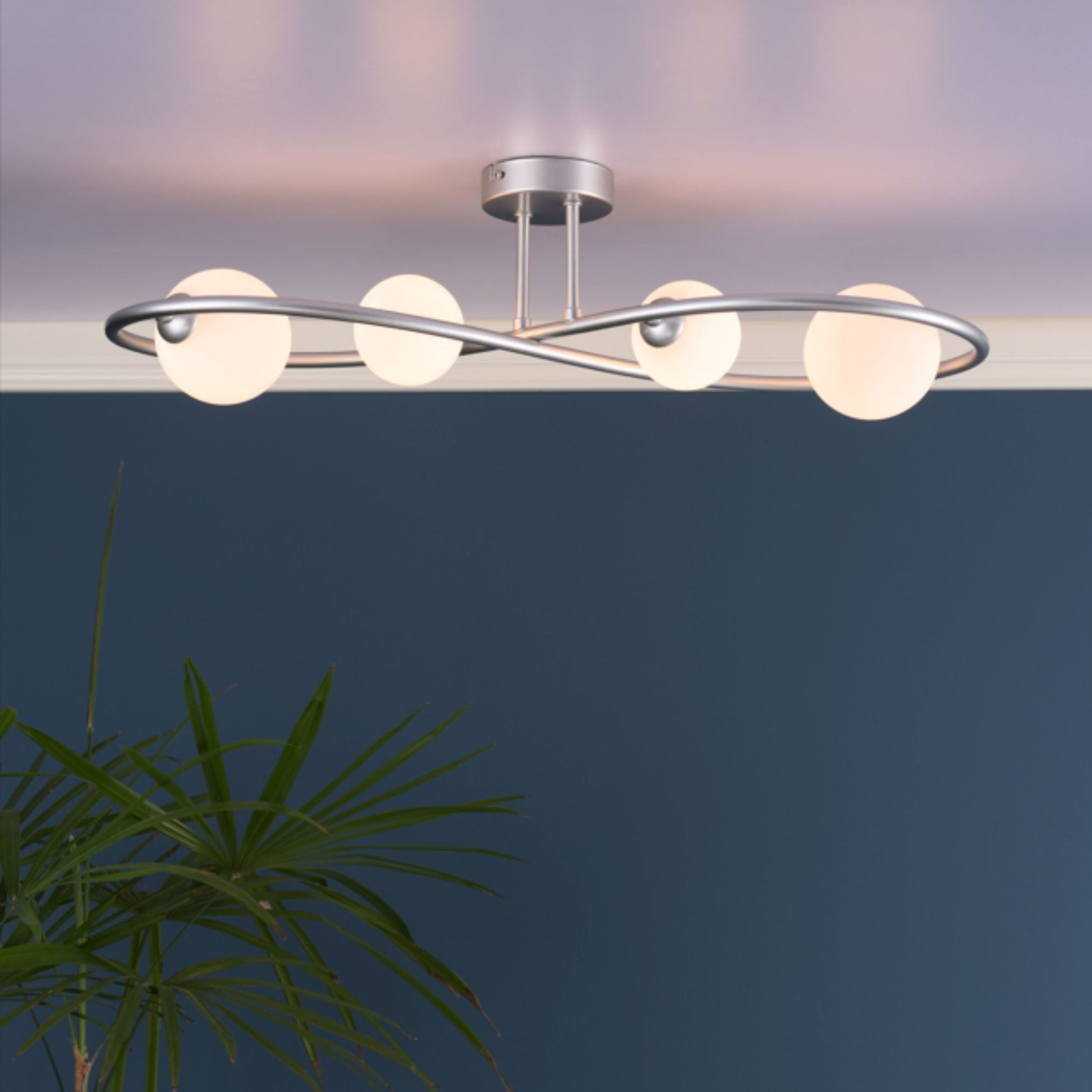 Lena 4-light semi flush ceiling light, featuring a twisted, linear design, opal glass globe shades and a matte silver finish.