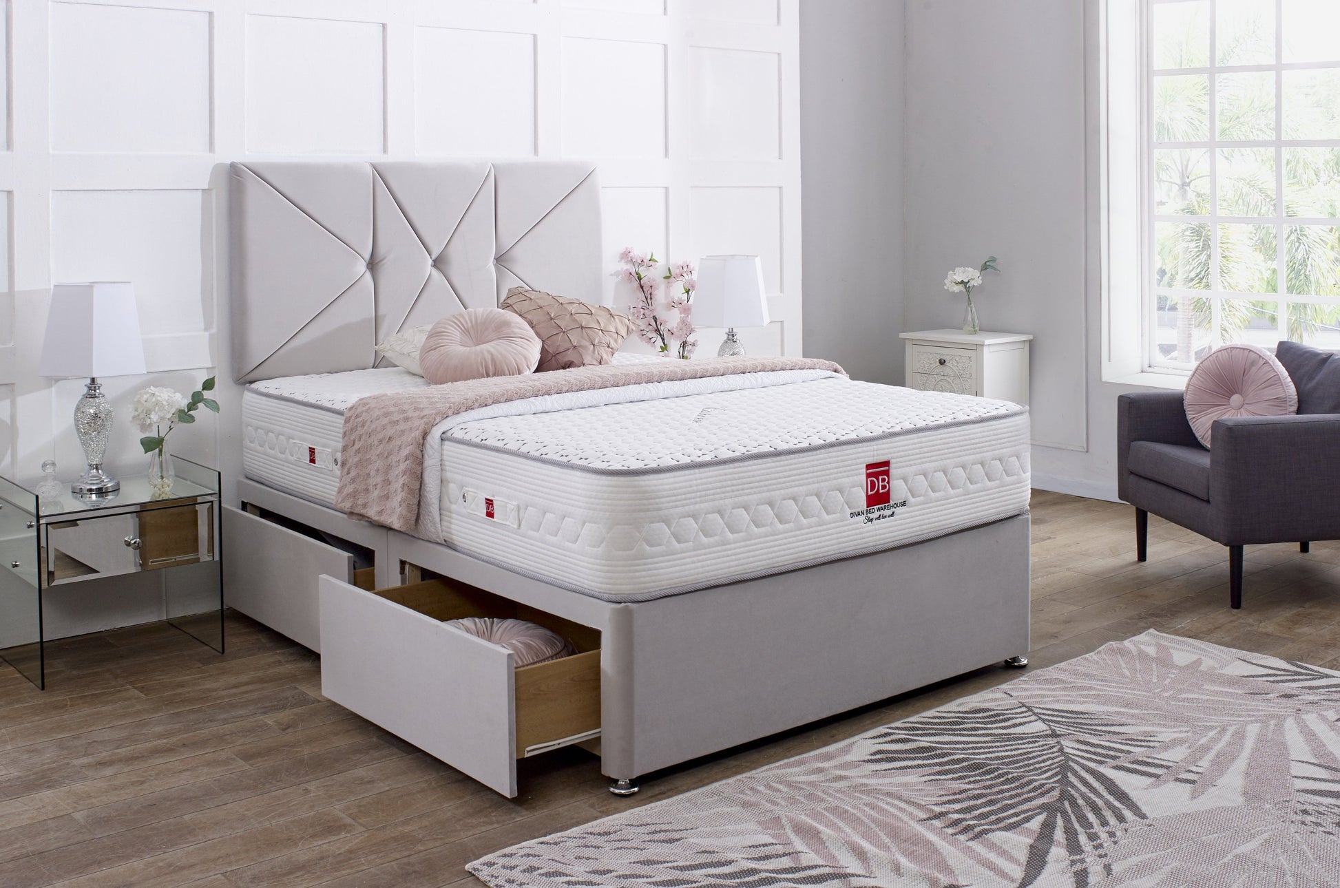 The divan base features 4 beautifully positioned chrome gliders as feet and also a number of chrome elements on the divan bed base itself in order to add a hint of elegance and style to your bedroom. The set includes a luxury mattress of your choice. Includes Hand Crafted and Pleated Diamanté Headboard.