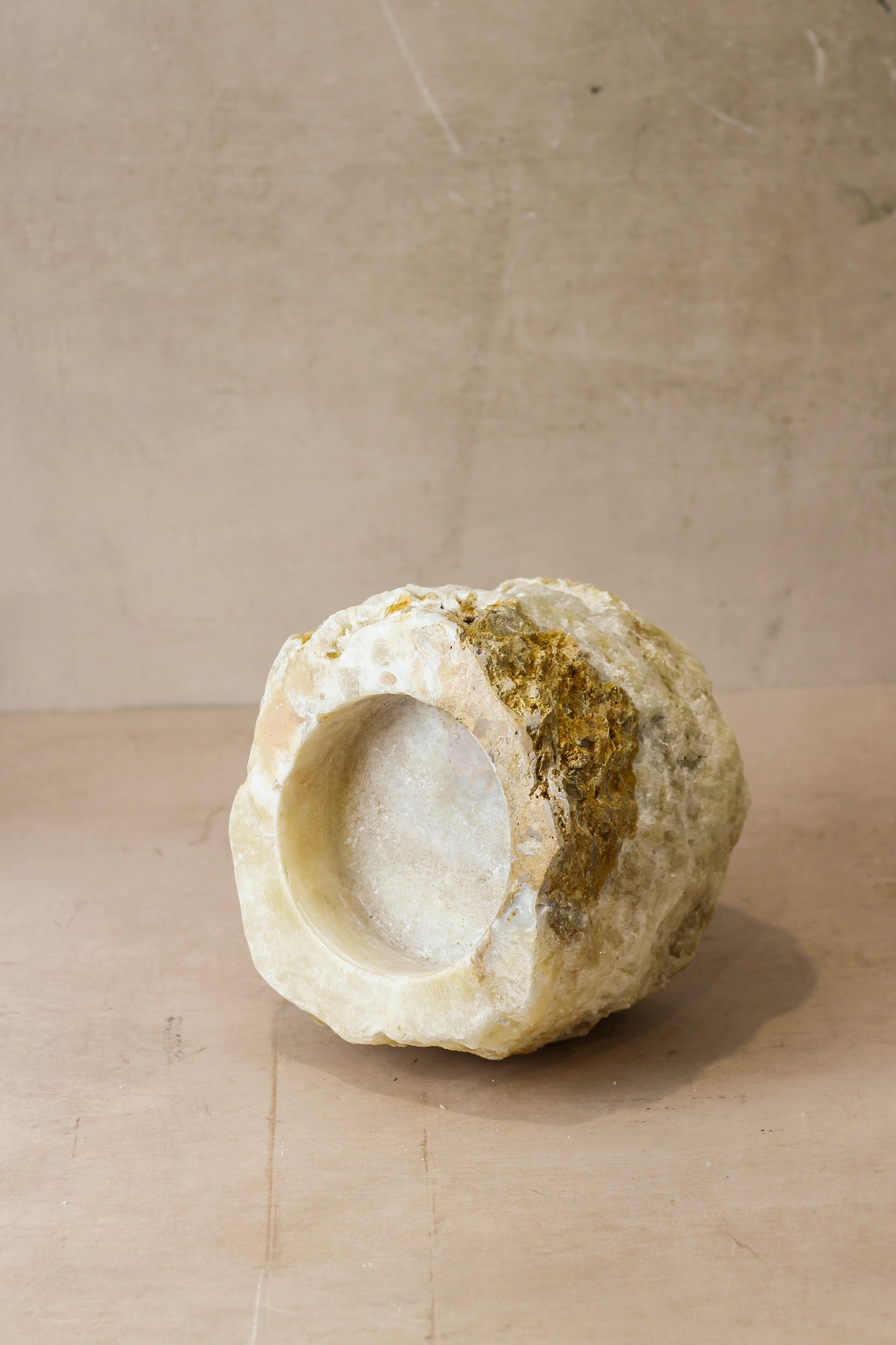 This elegant rough cut onyx candle holder is designed to hold a large candle, offering a sophisticated accent for your home. Its polished top contrasts beautifully with raw, textured sides that showcase natural pitting and cavities, embodying the organic beauty of the stone. Each candle holder is truly one-of-a-kind, with unique variations in tone, veining, and silhouette, celebrating the timeless charm and imperfections of ancient onyx.