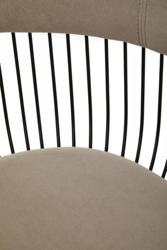 This chair is a blend of contemporary and art deco styles. It has plush mink velvet upholstery and a curved back. The seat is supported by a slim stainless steel frame with a bold black accent that sets off the pale hue of mink beautifully.
