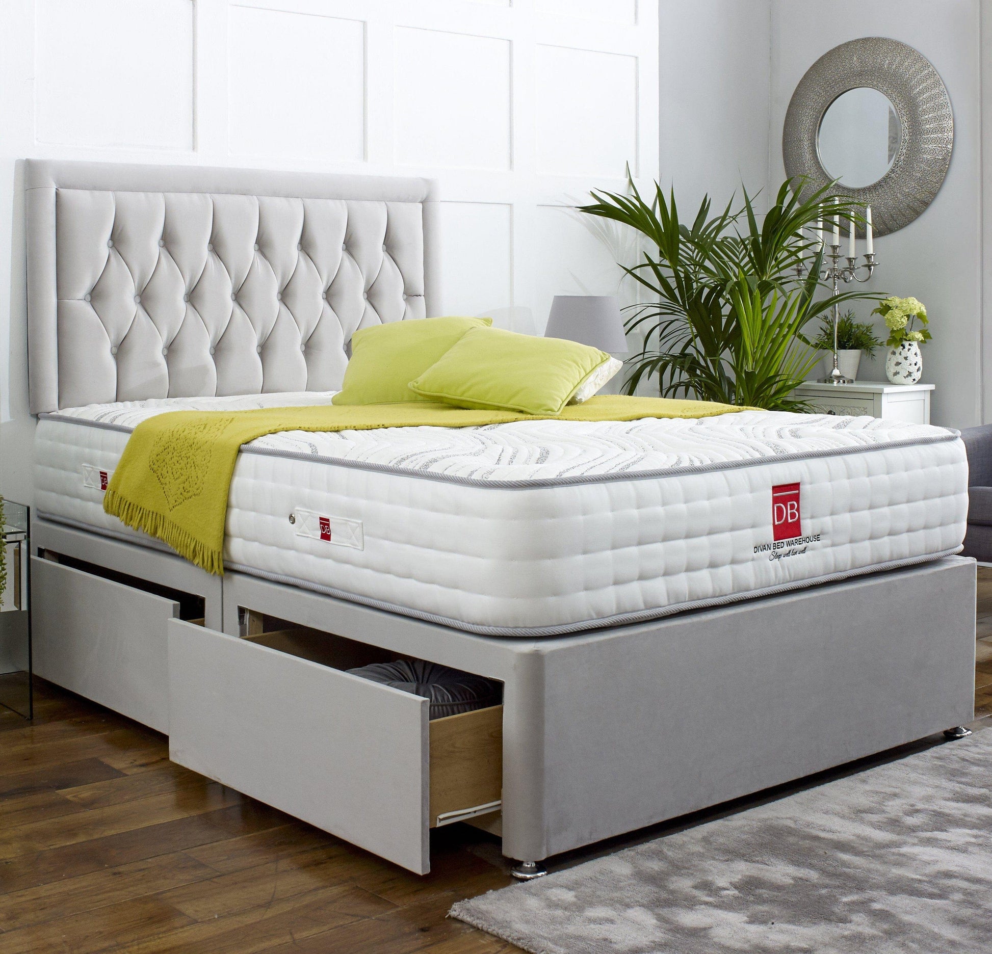 The divan base features 4 beautifully positioned chrome gliders as feet and also a number of chrome elements on the base itself in order to add a hint of elegance and style to your bedroom. The set includes a luxury mattress of your choice. Includes Hand Crafted and Pleated Fabric Button or Diamanté Headboard.